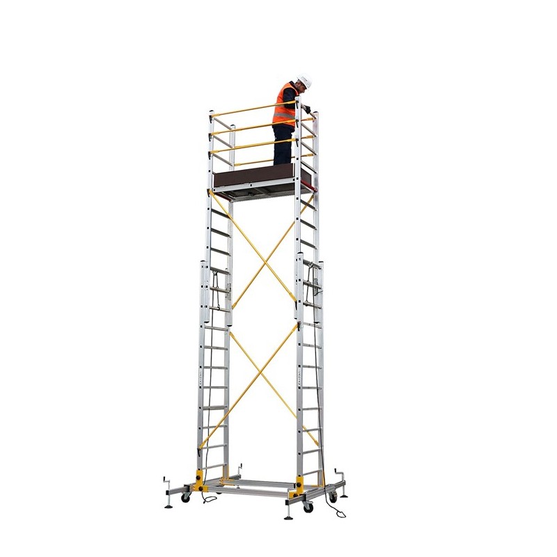 Diseñado para el uso profesional, se compone de dos escaleras telescópìcas apoyadas sobre una base con ruedas con freno y 4 niveladores.