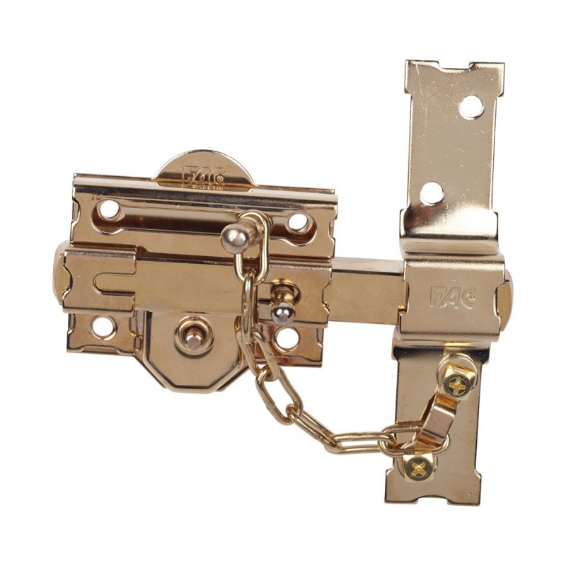 Cerrojo Modelo 300-R Fac DoradoCerrojo de sobreponer doradoModelo 300-R/80Refuerza la seguridad con elegancia usando el Cerrojo Modelo 300-R Fac en tono Dorado. Este cerrojo combina un diseño distintivo con la robustez necesaria para brindar una seguridad adicional a tus puertas. Fabricado con precisión y acabado en dorado, añade un toque de estilo a la...