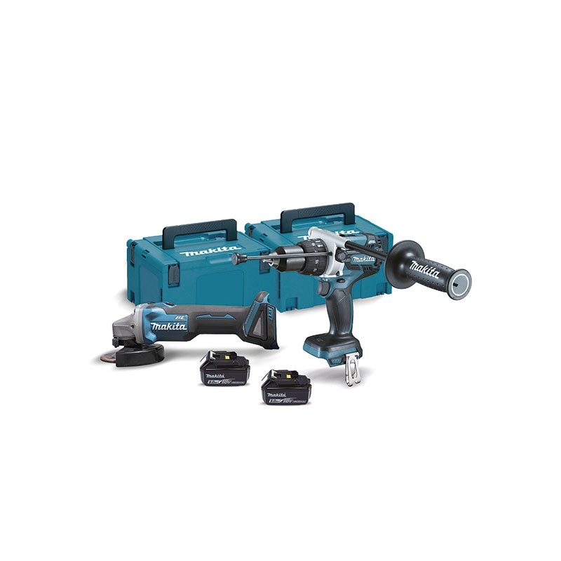 Descubre la potencia y versatilidad en tus manos con el Combo Makita DLX2130TJ2, que incluye las herramientas DGA504Z y DHP481Z, alimentadas por potentes baterías de 5,0Ah.