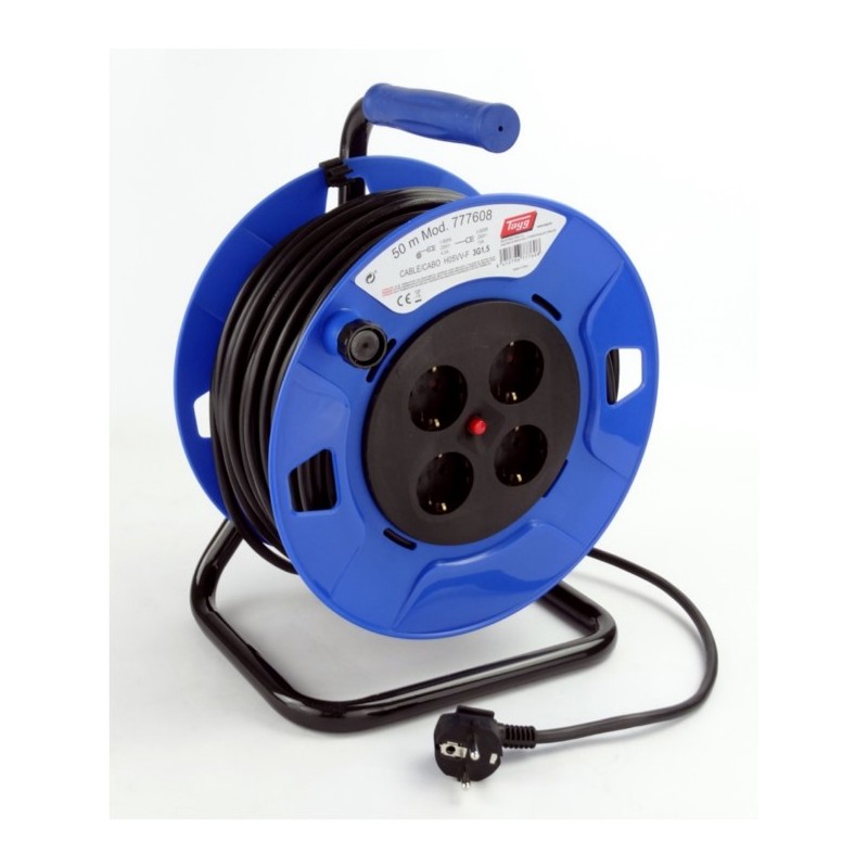 Enrollacables 50 Metros 4 Tomas 3X1.5MmEnrollacables eléctrico de 50 metros con 4 bases. Cable H05VV-F de 3x1.5mmPotencia máxima 250V 16A 3500W y grado de protección IP-20