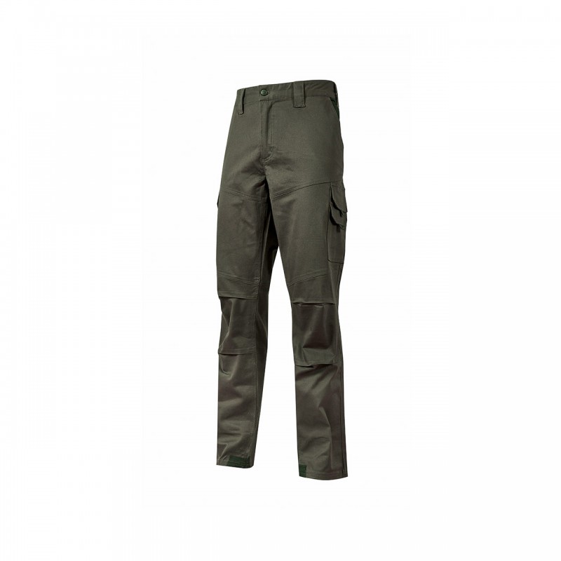 Pantalones de trabajo U-Power grey iron dark green modelo guapoPantalones de trabajo de algodón elástico. Con dos amplios bolsillos laterales multifuncionales, dos bolsillos delanteros y uno trasero.