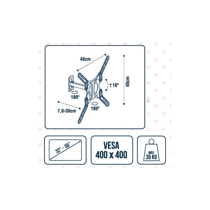 Soporte televisión 32-55´ giratorioSoporte televisión vesa 400x400 para televisiones de 32 a 55 pulgadasCarga máxima 40 kilosGiratorio 180º horizontalGiratorio +/- 10º vertical7-55.5 cm separacion paredVesa 40x40 cm